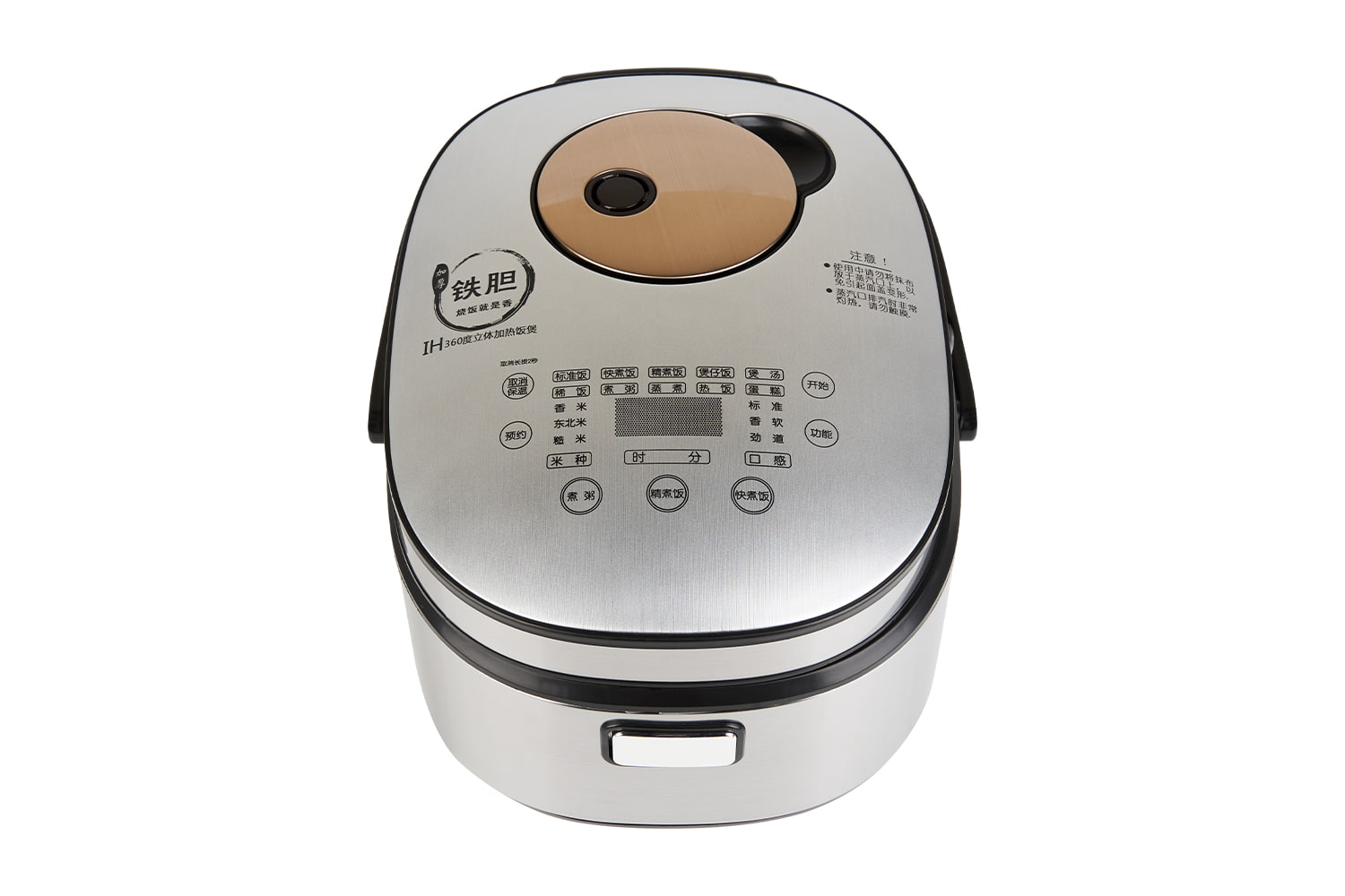 保溫/取消、預約、開始、功能選擇、 米種選擇(香米、東北米、糙米)、 口感選擇(標準、香軟、勁道)、時、分
